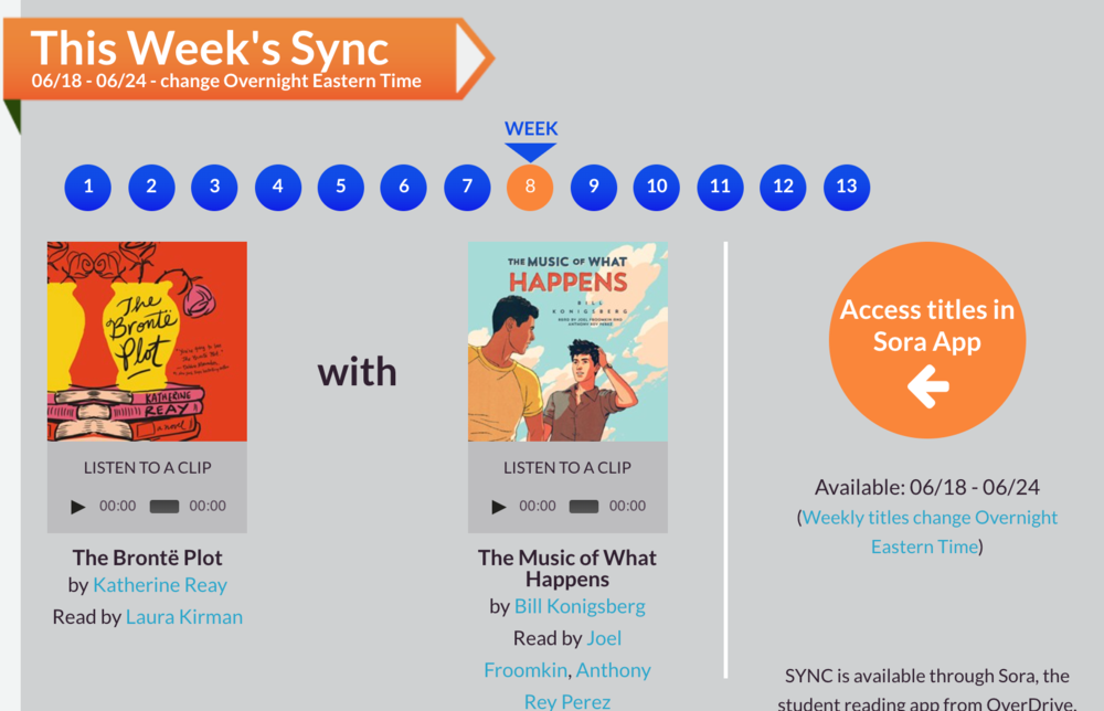 Week 5 is ready for download. Use the SORA app and find them on the Audiobook Sync shelf.